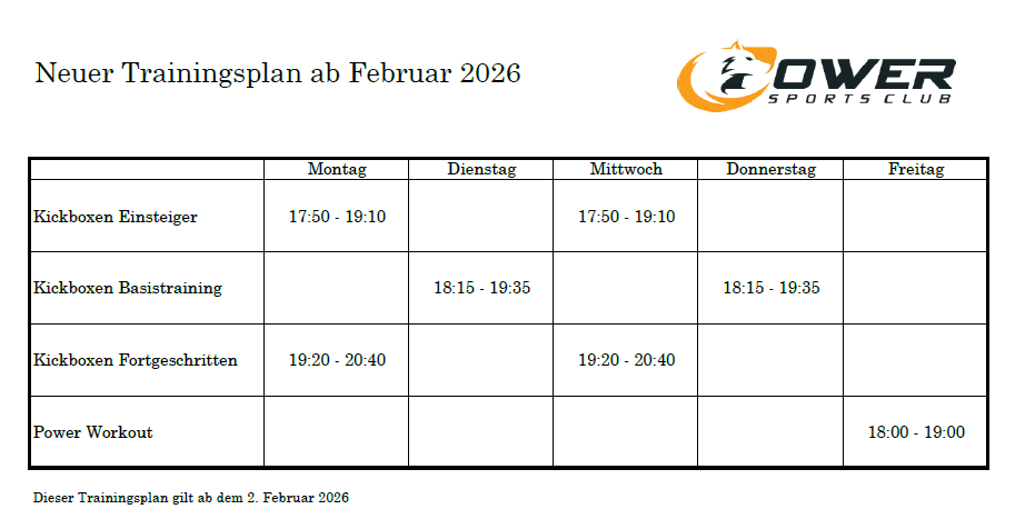 Die Trainings am Montag und Mittwoch sowie das Power Workout am Freitag finden wie gewohnt statt. Am Dienstag, Donnerstag und Samstag gibt es keine Trainings. Alle Dienstag- / Donnerstag- und Samstag (Kids)-Kickboxer*innen können jetzt am Montag und Mittwoch ins erste Training kommen. Für alle Fortgeschrittenen-Kickboxer*innen ist das zweite Training geeignet. Diejenigen Basis-Kickboxer*innen, die bereits eine Ausrüstung haben, können mit den Fortgeschrittenen im zweiten Training trainieren. Die anderen können wie gewohnt beim 1. Training teilnehmen. Hier noch der Trainingsplan: https://www.powersportsclub.ch/trainingszeiten.